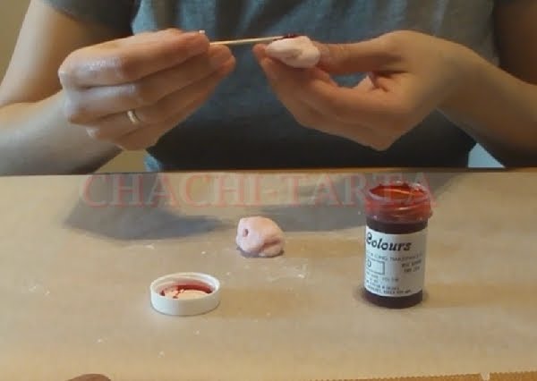 Transcurrido el tiempo de reposo ya puedes proceder a pintar las piezas que necesites, es mejor usar colorantes en gel (yo he usado de la marca Sugarflair, vienen etiquetados como sin gluten), los colores quedan más uniformes y se añade menos humedad a la pasta. Para pintarlos ayúdate de un palillo de madera, coge un poquito de colorante y úntalo en la pasta, con las manos intenta frotar y estirar muchas veces, te recomiendo veas el videotutorial que he preparado al final de esta publicación. Es mejor empezar poniendo poco pues así puedes añadir más y repetir la operación hasta llegar a la tonalidad deseada.