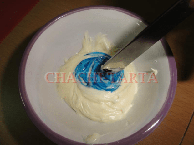 Con un palillo de madera o la puntita de una cucharilla fina, coge un poquito de colorante azul e incorpóralo a la crema, remueve y si ves que está muy pálido puedes repetir la misma operación hasta llegar al tono deseado, eso si, cada vez que cojas colorante hazlo con un palillo o cucharilla limpia para evitar que le queden restos y contaminen los frascos de colorante.