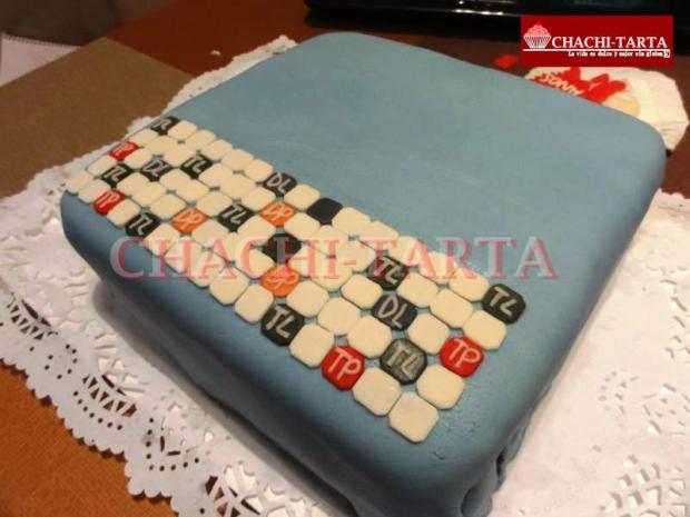 El bizcocho es de chocolate, el mismo que he preparado otras veces (que le vamos a hacer somos adictos!) y la decoración está hecha totalmente de fondant de nubes (hecho en casa), incluso los muñequinos que he puesto por encima del tablero; los cuales tuve que hacer con tiempo para que pudiesen secar y endurecer un poco.