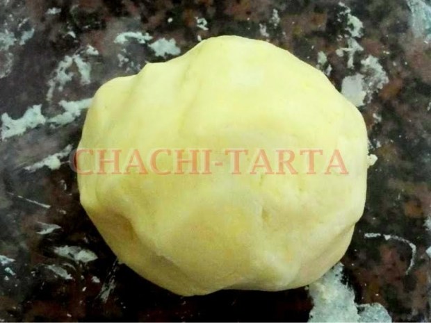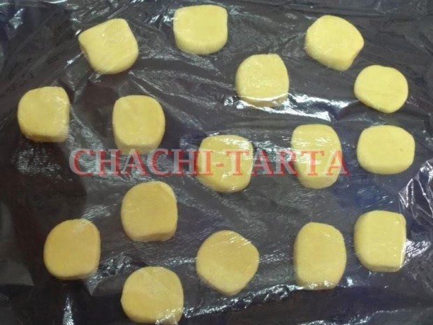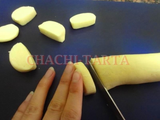 Forma un cilindro con la masa (de más o menos unos 20 cm) y corta porciones más o menos del mismo tamaño, colócalas sobre una bandeja y cúbrelas con papel film por encima para evitar que se resequen, deja reposar durante unos 10 minutos.