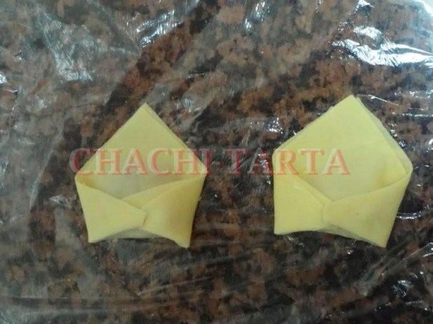 Recorta los bordes a manera de formar un cuadrado, coloca el relleno preparado previamente y unta un poco de huevo batido por los laterales, junta dos esquinas opuestas a manera de formar un triángulo y dobla los extremos hacia adentro.