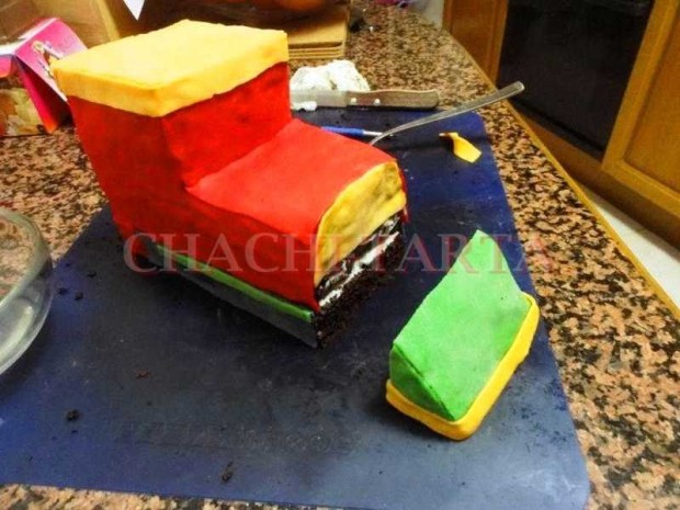 Podía haber comprado un molde para hornearlo ya con la forma del tren pero la verdad preferí hacerlo manualmente recortando partes del bizcocho y luego uniéndolas con nata montada, que posteriormente he ido cubriendo con fondant para finalmente pegar los muñequines. Tienes un videotutorial al final de esta publicación para que no te pierdas ni un detalle.