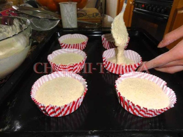 Prepara unos moldes de magdalenas y rellena a 3/4 partes, los que yo he usado son de papel y son un poco más grandes de lo normal, para prevenir que no se deformaran durante el horneado he puesto doble cápsula.