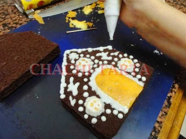 Utiliza un cuchillo muy afilado para cortar las piezas, únelas con el relleno que desees (yo he puesto nata montada con cacao y azúcar), decora con glaseado a base de azúcar, leche y sirope de maíz, ten en cuenta utilizar una manga pastelera con boquilla muy muy fina, a mi me ha costado un poco porque la que usé no era lo suficientemente fina pero aún así ha quedado bastante bien.
