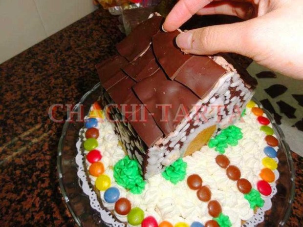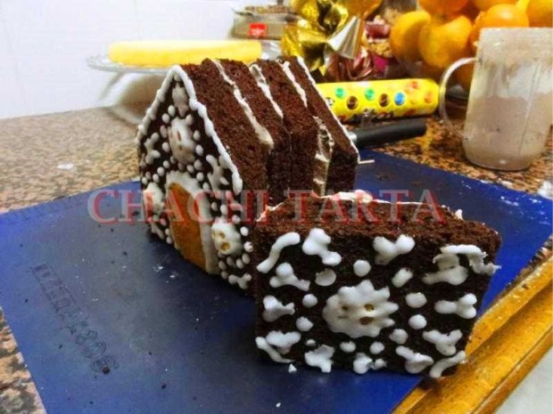 Como siempre suelo hacer, los bizcochos los he horneado de un día antes para asegurar que estén totalmente fríos. Una vez eso, corta las piezas de la casita del bizcocho de chocolate; como es complicado explicar con muchos detalles he hecho un vídeotutorial que puedes ver al final de esta publicación.