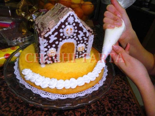 Coloca la casita por encima del bizcocho de naranja y cubre toda la superficie con nata montada utilizando una manga pastelera con boquilla rizada, he puesto LACASITOS en todo el borde para que quede mucho más colorida.