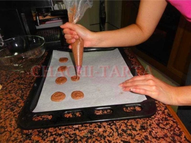 Mezcla cuidadosamente para evitar que se bajen mucho, de preferencia con ayuda de una espátula haciendo movimientos envolventes; cuando hayas incorporado el cacao coloca la mezcla en una manga pastelera con boquilla lisa; prepara la bandeja del horno con un trozo de papel vegetal o alfombrilla de silicona y dosifica para formar las galletas dejando una separación de al menos unos 3 centímetos entre cada una.