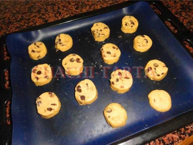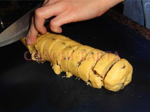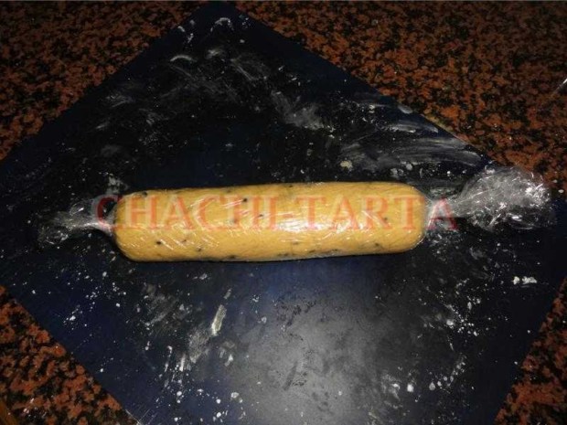 Estira un poco la masa y añade las pepitas de chocolate, y continúa amasando para distribuirlas, forma un cilindro de unos 15 cm de largo y envuélvelo en papel film transparente, deja reposar en la nevera durante al menos 2 horas para que se endurezca.