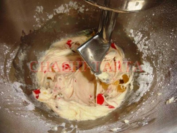 Pon a templar la leche al microondas durante unos 30 segundos, añade en ella la levadura desmigada y deja reposar 15 minutos, verás como ha fermentado la levadura. Incorpórala a la harina y añade la mantequilla o margarina, los huevo, la vainilla, el azúcar y la sal, amasa hasta que todos los ingredientes estén integrados y se forme una masa pastosa pero sin grumos. Corta la fruta confitada en trocitos pequeños y agrégalos a la masa, continua mezclando hasta que los trocitos de fruta se distribuyan por toda la masa.