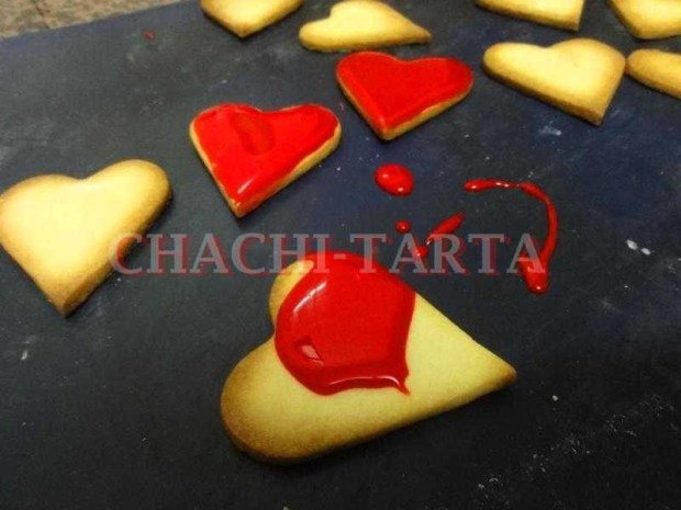 Cuando ya esté fría, desenvuelve y extiende en un trozo de papel vegetal o alfombrilla de silicona, espolvoreando harina de arroz por encima para evitar que se nos quede pegada. Con un cortador en forma de corazón, corta las galletas dejando un margen de separación de al menos 3 cm (lo digo porque se me han pegado un poquito entre sí) y hornea a 200 grados durante 10 minutos. Retira y deja enfriar completamente antes de decorar.