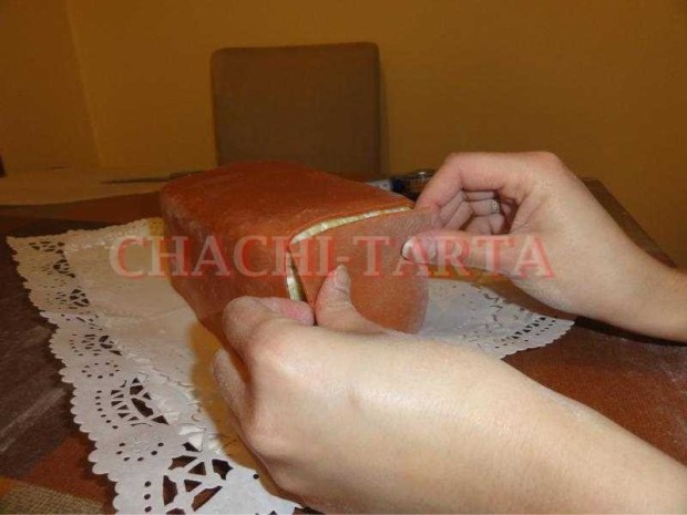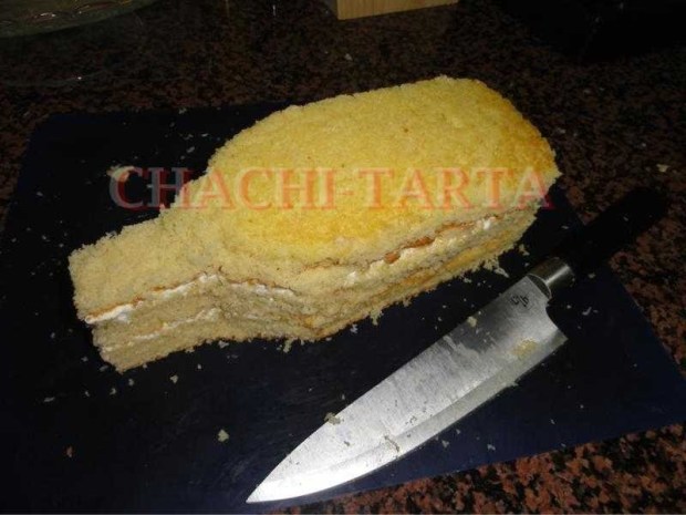 Horneados los bizcochos y completamente fríos, procede a rellenarlos con nata montada con azúcar, recorta con un cuchillo hasta formar la botella, unta más nata por encima y procede a decorar.