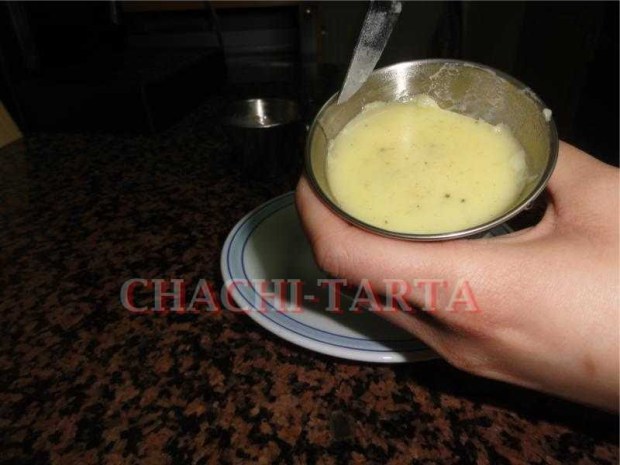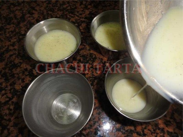 Finalmente añade las láminas de gelatina neutra hidratadas y remueve constantemente hasta que llegue a ebullición, cuando eso retira y vierte en los moldes deseados, yo he utilizado unas flaneras de aluminio.