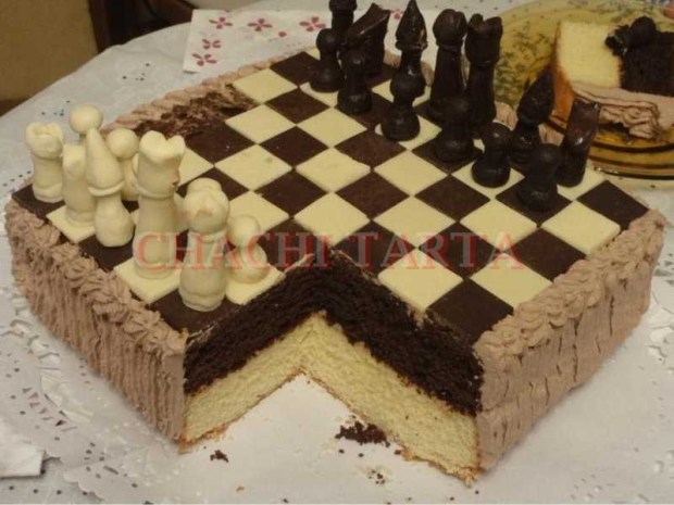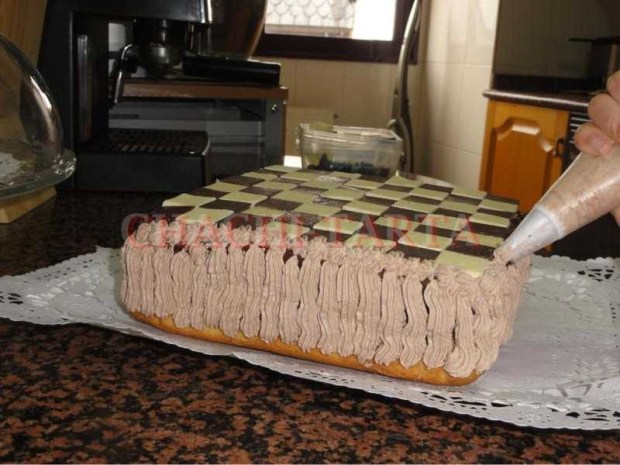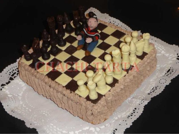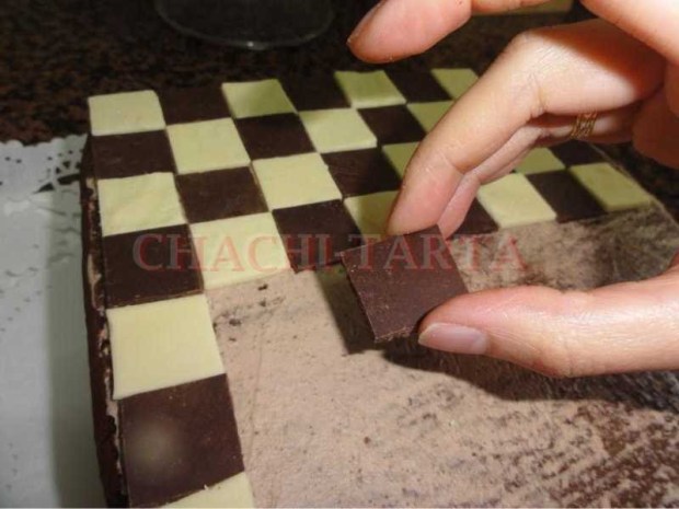 Para el tablero extiende el chocolate plástico con un rodillo al igual que el fondant, recorta cuadrados a medida tanto de chocolate blanco y negro que luego haz de colocar en la superficie. Previamente tendrás que haber rellenado la tarta; yo utilicé nata montada con azúcar y cacao en polvo; ésta misma crema la he usado para untar por la superficie para asegurar que las piezas del tablero se adhieran.