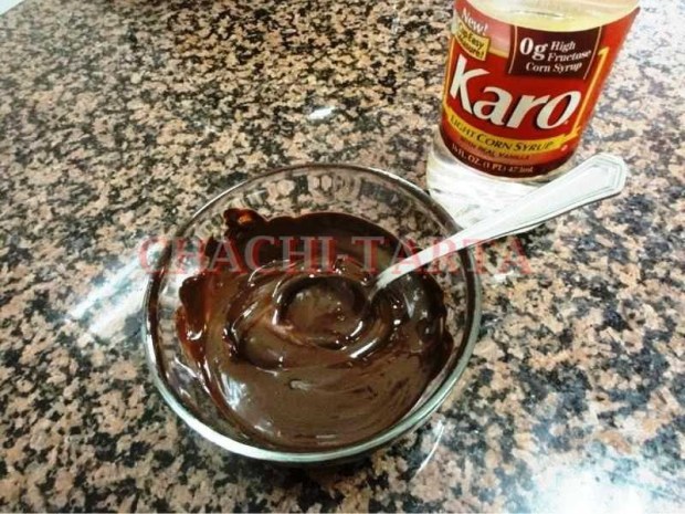 Funde el chocolate al baño maría o al microondas e incorpora el sirope de maíz o glucosa, mezcla rápidamente con ayuda de una cuchara; verás que obtienes una mezcla densa y elástica. Envuelve en papel film y deja que enfríe a temperatura ambiente durante unas 2 horas antes de utilizarlo.