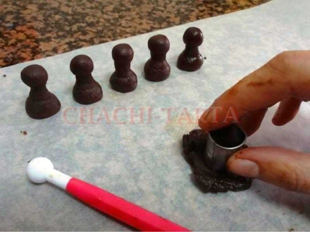 Para la decoración (el tablero y las piezas) he usado chocolate plástico, éste se suele encontrar en tiendas especializadas de pastelería o puedes elaborarlo fácilmente en casa, para ello necesitarás las mismas proporciones de chocolate (negro o blanco) y sirope de maíz (KARO– sin gluten) o glucosa.