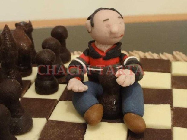 Como nunca puede faltar en mis tartas, he hecho un muñequín (con un poco de prisas) que he colocado por en medio de la tarta a último momento junto con las piezas.