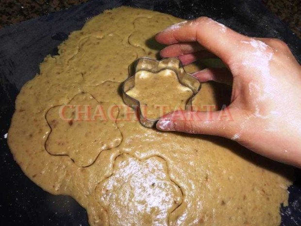 Cuando ya esté endurecida calienta el horno a 200 grados, mientras va cogiendo calor estira la masa con ayuda de un rodillo en la mesa o encimera espolvoreando harina de arroz para que no se pegue y sea más fácil de manipular. Yo siempre suelo usar una alfombrilla de silicona, así ya no tengo ni necesidad de moverlas una vez que las haya cortado, si tienes papel vegetal con eso también vale.