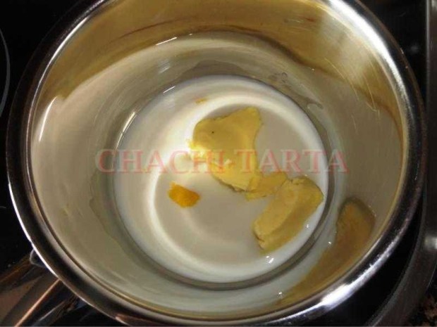 Pon a calentar la leche junto con la mantequilla, el azúcar, la pizca de sal y la corteza de limón, mezcla con una cuchara y remueve hasta que todo se integre bien y llegue a punto de ebullición.