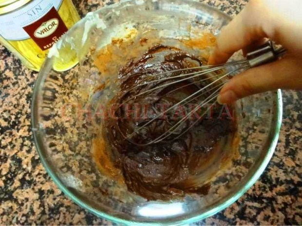 Tamiza la harina junto con la levadura (yo he usado harina marca EPSILON – sin gluten, y levadura HACENDADO, también sin gluten) e incorpórala removiendo poco a poco hasta que la mezcla ya no tenga grumos. Divide la mezcla en 2 partes iguales, a una de ellas añádele la ralladura de naranja y al otro el cacao en polvo (la marca VALOR es sin gluten) y la leche, con un poquitín vale, es solo para que no quede la mezcla muy densa pues el cacao en polvo tiende a espesar.