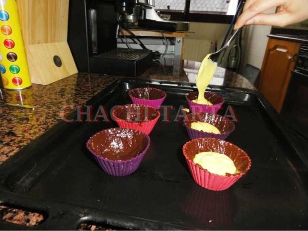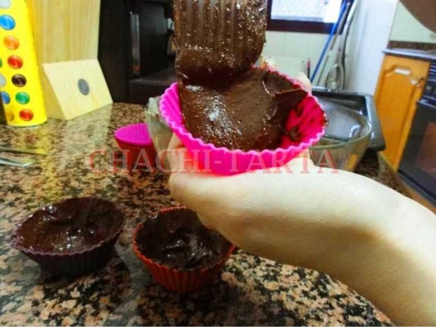 Una vez mezcladas las dos masas, procederemos a repartirla en los moldes; yo los he usado de silicona, es fundamental que sean de silicona ya que de esta manera nos será mucho más fácil desmoldarlos y que cojan la forma deseada. Empieza untando los moldes con la mezcla de chocolate ayudándote de una espátula, de tal manera que cubras toda su superficie, pero no los llenes demasiado porque posteriormente deberás colocar en el centro 1 cucharada de la mezcla de naranja, calcula que se cubran a 3/4 partes de los moldes.