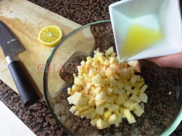 Lava la manzana, pela y corta en daditos pequeños, exprime el zumo de limón y viertelo por encima de la manzana troceada, ésto evitará que se oxide y a la vez potenciará su sabor. Resérvala.