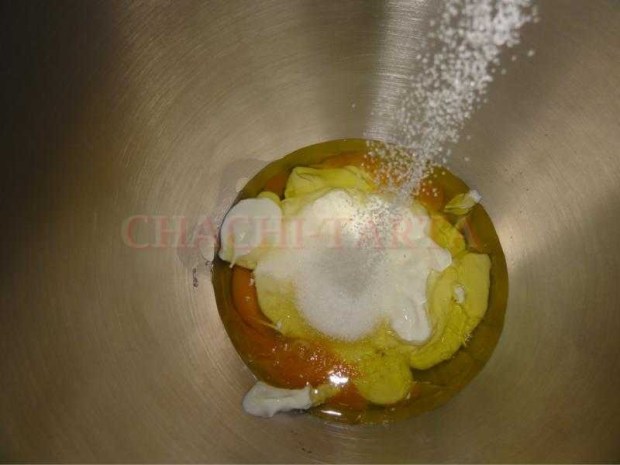 Mezcla la harina con la levadura y tamiza, yo he usado de las marcas Schar Mix C y HACENDADO, respectivamente, ambas son sin gluten. En otro cuenco mezcla el aceite, el huevo, el yogur natural (la marca KAIKU es sin lactosa), el azúcar blanca y el aroma de vainilla (la marca Dr Oetker es sin gluten).