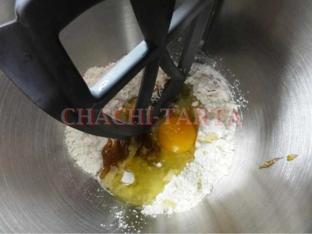 Mezcla en un cuenco la harina (en mi caso sin gluten, marca Schar Mix B), añade la levadura fresca desmigada (marca LEVITAL es sin gluten), agrega la almendra molida, el aceite, el huevo, la miel y el agua de azahar y la pisquina de sal.