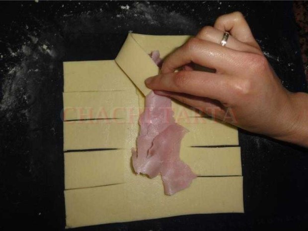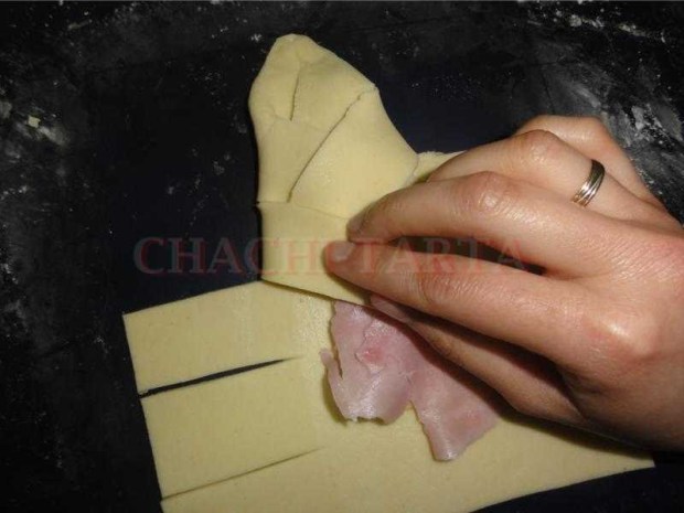 Transcurrido el levado, divide la masa en 6 partes iguales (puedes pesarlas sino), y extiende cada una con ayuda de un rodillo, forma un rectángulo y en las costados corta tiras más o menos del mismo grosor, coloca por en medio una loncha de queso para sándwich y tiras de jamón de york, dobla los extremos formando una trenza y sellándolo con las yemas de los dedos.