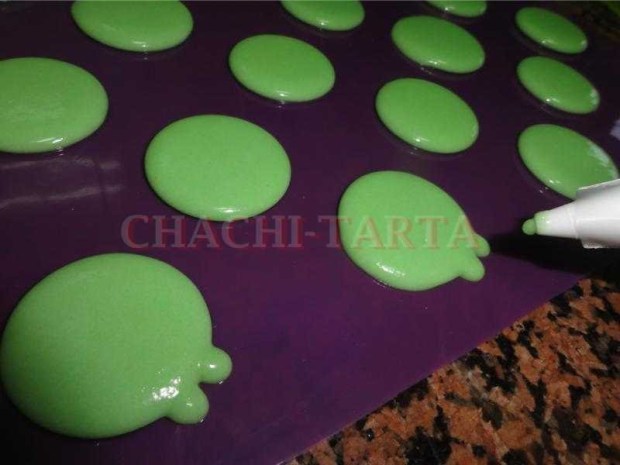 Introduce la mezcla en una manga pastelera con boquilla lisa (no muy fina ni muy gruesa, y dosifica los macarrons al tamaño que desees sobre una hoja de papel vegetal. Yo como soy un poco «patosa» y no calculo muy bien, tengo unas alfombrillas de silicona que son especiales para macarrons, ya traen marcados los bordes para que todos salgan exactamente del mismo tamaño, resultan bastante útiles la verdad.