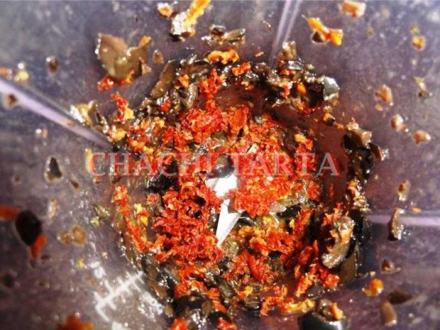 En la licuadora, coloca las aceitunas negras, el tomate seco, un poquitín de aceite de oliva, albahaca (puede ser fresca o seca) y una pizca de sal; las cantidades son un poco al gusto de cada quien. Tritura todo ligeramente, de modo que quede una pastita con trocitos no muy grandes ni muy finos. Reserva.