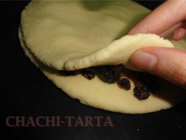 Distribuye la cebolla caramelizada por toda la superficie de una de las partes, incorpora también el pesto de aceitunas con tomate y cubre con la otra parte de la masa.