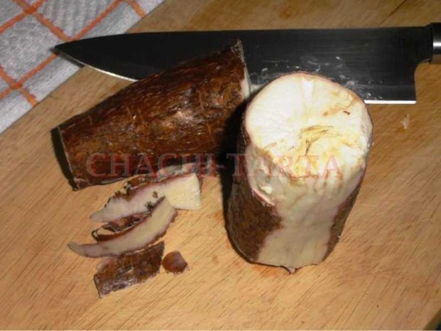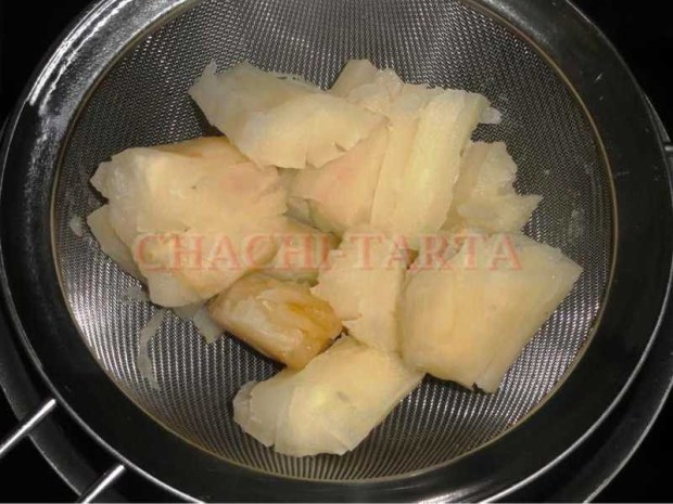Con un cuchillo bien afilado pela la yuca y corta en trozos medianos, ponla a cocer en abundante agua con sal a fuego medio durante unos 20 minutos. Esto es importante ya que a pesar de tener muy buen sabor, la yuca es uno de los alimentos más tóxicos que existen, si se consume sin cocer puede que te intoxiques ya que contiene cianuro!!