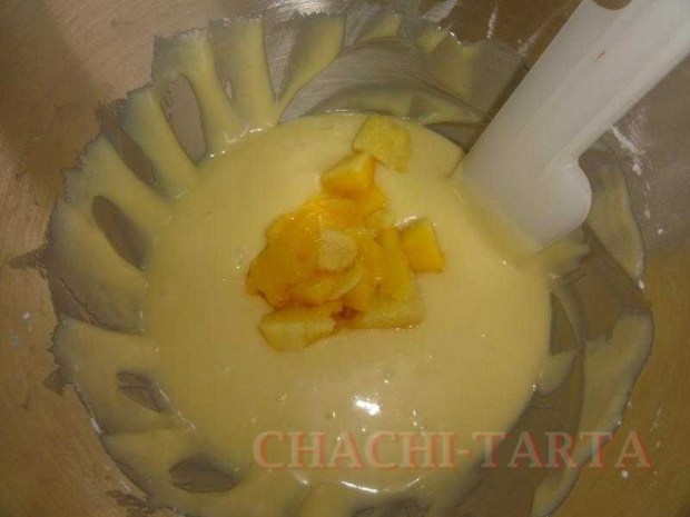 Mezcla a mano utilizando una espátula hasta que el mango se haya distribuido uniformemente en la mezcla, me encanta dejar trocitos de fruta en las magdalenas pues de esa forma siento que saben mejor.