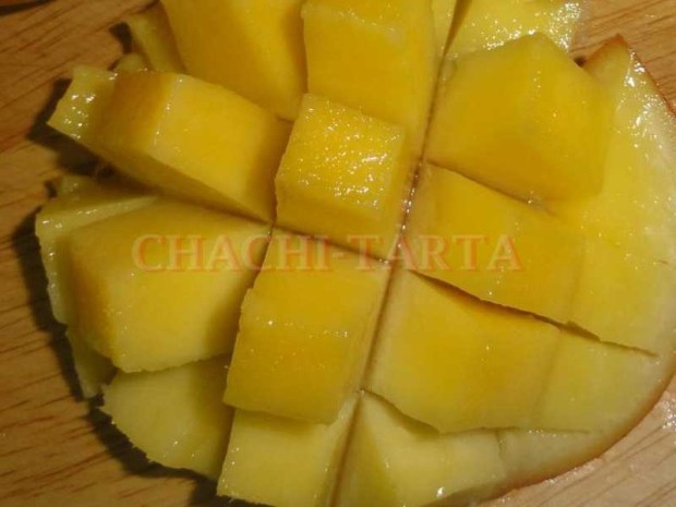 Lava y corta el mango en 2 tajos, retira la pulpa; para hacerlo muy fácil has unos cortes como formando cuadros y presiona con los dedos hacia arriba, con un cuchillo recorta los dados y reserva.