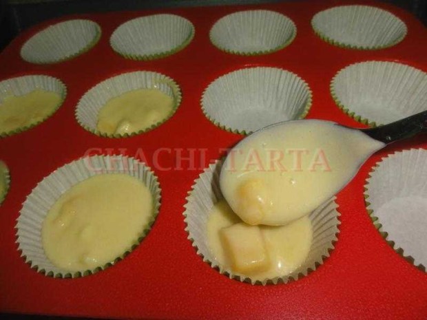 Rellena los moldes para magdalenas a 3/4 partes, yo he usado un molde de silicona que me resulta muy práctico, no hace falta poner cápsulas pero yo por lo general siempre pongo, me gusta como se ven y más aún cuando son para regalar.