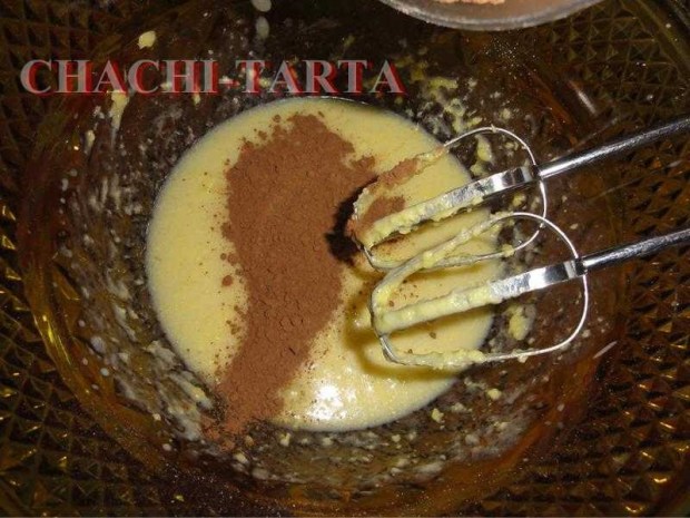 Poco a poco añade la mezcla tamizada del cacao y levadura (o polvos para hornear) a cucharadas, removiendo constantemente de preferencia con varillas o batidora eléctrica hasta integrar.