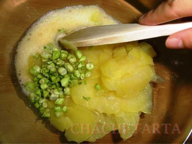 Lava y pela las patatas en láminas muy finas, fríelas en abundante aceite caliente, escurre y añade un poco de sal; también puedes hacerlas al vapor o al microondas si no quieres utilizar mucho aceite, la idea es que queden blandas.