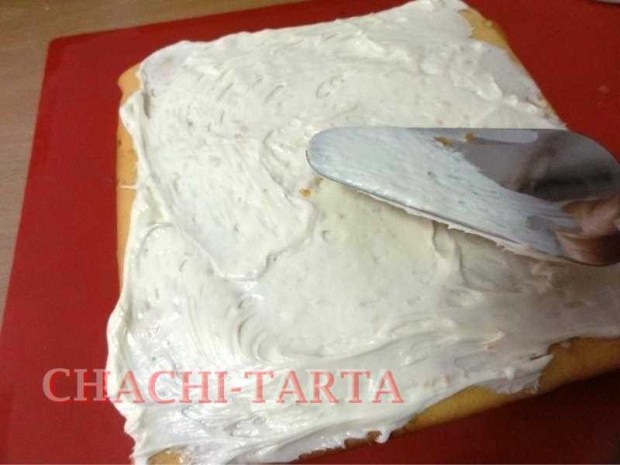 Para la tarta he tenido que hornear 2 bizcochos de forma cuadrada, de 21x21x7cm que posteriormente he procedido a rellenar con nata montada con azúcar y aroma de vainilla.