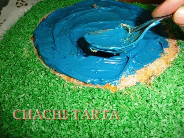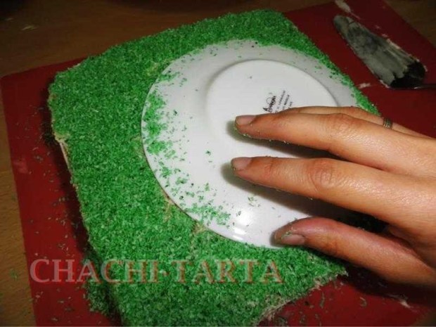 Unta abundantemente por en medio de los dos bizcochos y ligeramente un poco por toda la superficie. Para simular el césped he utilizado coco rallado pintado de color verde; para no mancharte las manos te recomiendo que pongas el coco en una bolsa y añadas el colorante con un palillo, cierra la bolsa y empieza a remover hasta que todo quede uniforme; yo no lo hice y me quedaron las manos perdidas!!!