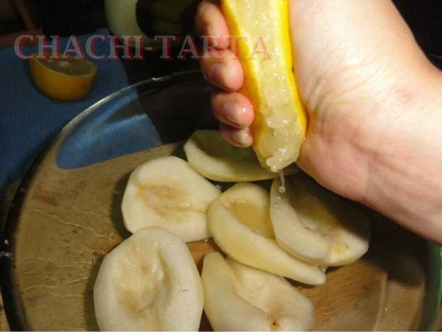 Lava y pela las peras, parte por mitades y retira el corazón, agrégale el zumo de medio limón para evitar que se oxiden y reserva.