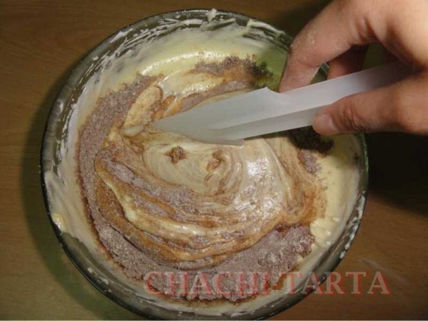 Agrega a cucharadas, poco a poco a las claras la mezcla de los ingredientes secos, continúa removiendo hasta integrar todo y que no se vean grumos, hay que hacerlo con mucho mimo para que no se bajen mucho las claras.