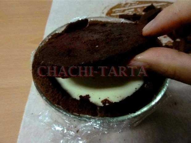 Horneado el bizcocho recubre un cuenco pequeño con papel film (esto para que luego no nos cueste desmoldar) y corta trozos de bizcocho de modo que cubran toda su superficie, vierte la mousse de chocolate y conserva en la nevera hasta que la mousse cuaje, pueden transcurrir unas 2 horas mas o menos.