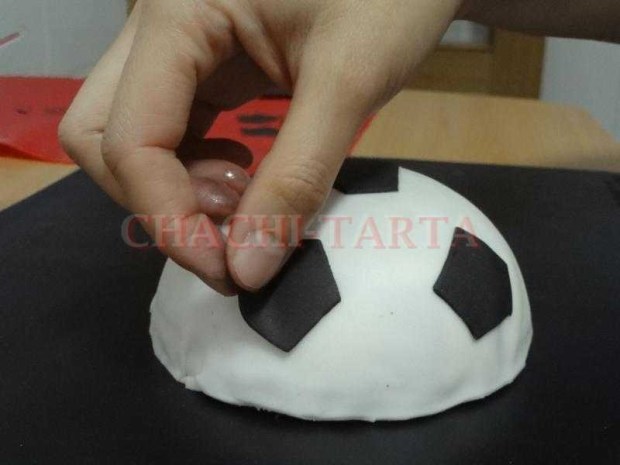 Una vez cuajada la mousse recubre el cuenco con otra pieza circular de bizcocho, desmolda y decora rápidamente con fondant blanco y negro para que parezca el balón de fútbol, yo utilicé fondant de la marca Dr Oetker, es sin gluten. Reserva en la nevera hasta terminar la decoración.