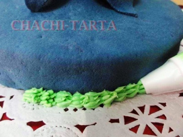 La cobertura de la tarta la he hecho con fondant casero, lo he preparado a base de nubes añadiendo el colorante azul directamente en la mezcla así me evitaba pintar tanta cantidad, eso sí, he tenido que prepararlo con varios días de anticipación