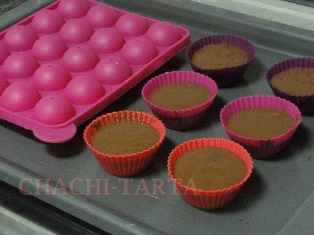 Reparte en otro cuenco 2/3 de la masa y añade unas gotas de aroma de vainilla (Dr Oetker – sin gluten) y al resto el cacao en polvo y la leche de soja. Dosifica la mezcla de vainilla en los moldes de cakepops y la de cacao en los de magdalenas y hornea a 180 grados durante 20 minutos.