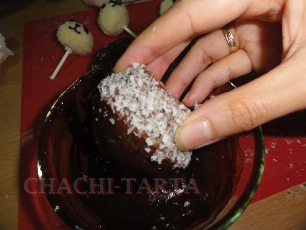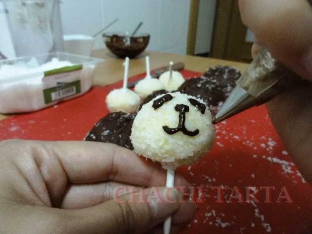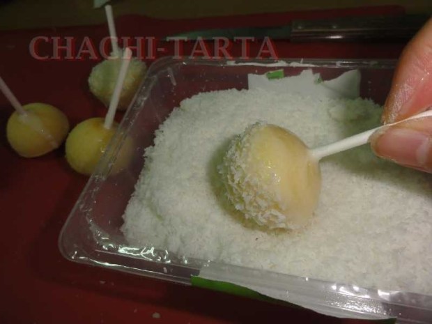 Mientras prepara el glaseado de azúcar mezclando ambos ingredientes con ayuda de unas varillas o batidora eléctrica. Coloca un poco de este glaseado en la punta del palo del pocake e introdúcelo con mucho cuidado para no romperlo, deja secar y a continuación sumerge los popcakes para que se impregnen bien, rebózalos en el coco rallado y resérvalos en un tupper mientras continuas decorando el resto.