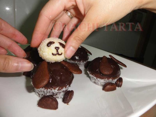 Para las patitas, la idea original que vi usaba galletas tipo Oreo, yo he horneado con la misma mezcla de las magdalenas todas y cada una de las piezas que posteriormente he ido colocando sobre la marcha.