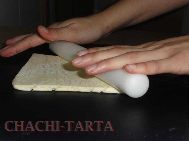 Descongela la masa (si la tienes congelada) y posteriormente extiende sobre la mesa de trabajo o encimera, de preferencia sobre una hoja de papel vegetal o alfombrilla de silicona. Con ayuda de un rodillo extiende ligeramente manteniendo una forma cuadrada, si ves que se te queda pingosa puedes espolvorear un poquito (pero muy poco) de harina sin gluten.