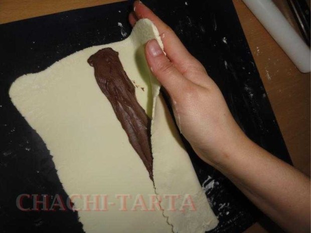 Con una cucharilla unta la nocilla o nutella por el centro del cuadrado de masa y dobla los extremos hacia el centro, puedes sellar los bordes humedeciéndolos con un poquito de agua. Te recomiendo no poner demasiada cantidad de nocilla pues con el horneado suele desbordarse un poco.