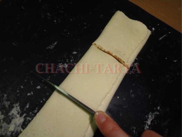 Formado el rollo, corta en secciones más o menos del mismo tamaño y colócalas en la bandeja del horno, yo he sacado 3 napolitanas por cada plancha de hojaldre, o sea en total me han salido 6.